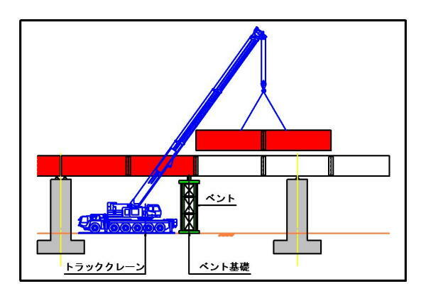 ■橋体の組立、架設にトラッククレーンを用いて架設する方法で、最も一般的な工法である。